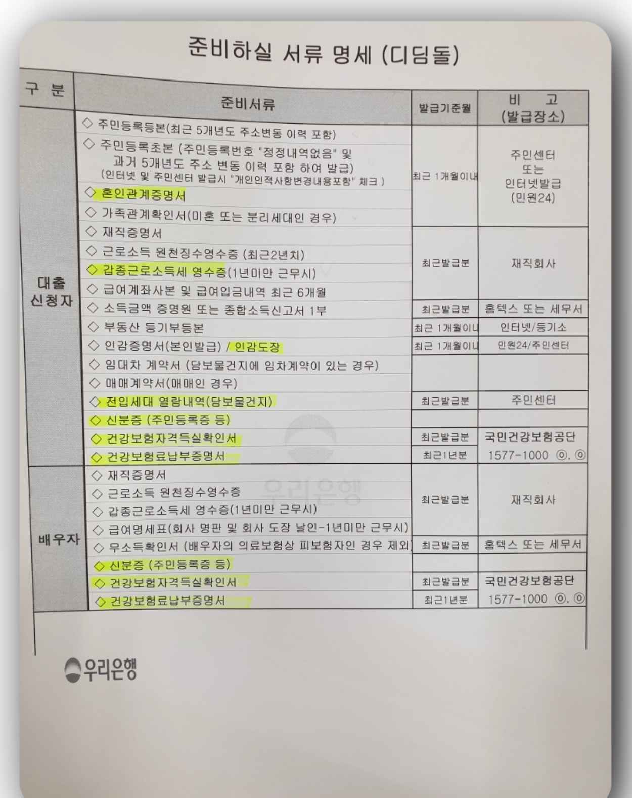 - 배우자 소득증명서 및 동의서 (배우자가 은행 방문하여 동의 필요)